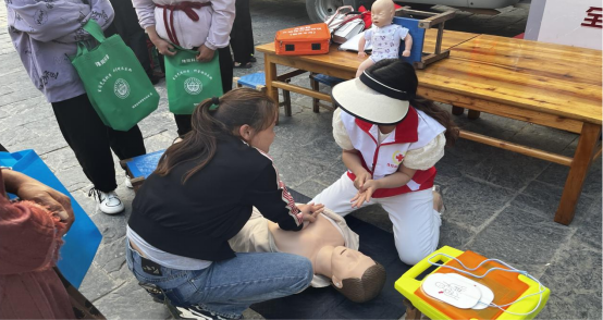 宣传折页发放结束后开展了应急救护知识现场普及演练。讲解期间,路人纷纷围观并提问:“溺水怎么抢救?”“这个AED要怎么用呀?哪里能找到呢?”“海姆立克急救法听说过但是没看过,能示范一下吗?”志愿者老师耐心讲解并作出示范动作,同时邀请路人上手练习操作,为提升群众自救互救能力而做奋斗,以实际行动助力健康中国,全面推进隆阳区健康县城建设工作。
