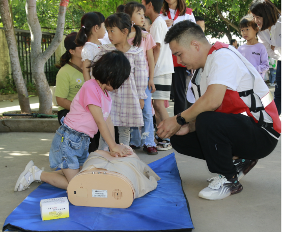 在接下来开展的游园活动中,州红十字会应急救护培训老师通过有奖问答的形式,为社区居民和儿童们普及交通安全知识,开展家庭安全教育,并现场进行心肺复苏教学。现场气氛活跃,不少群众和儿童积极参与抢答环节,动手学习心肺复苏实操,切实提高了青少年儿童及家长的自救互救能力,促进社区安全体系建设。