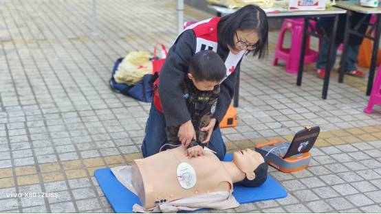 志愿者以“理论讲解+实操指导”形式,重点讲解心肺复苏(CPR)、气道异物梗阻急救(海姆立克法)、AED使用等适用急救技能,不少群众主动上前实操体验,志愿者耐心指导、讲解细节,让大家听得懂、学得会、用得上。