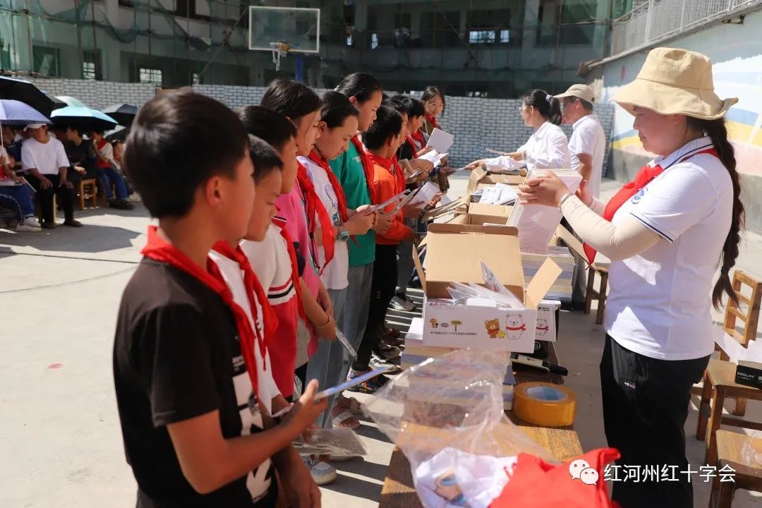 本次活动,屏边县红十字会向白云乡白泥塘小学6-12岁的300余名学生,捐赠了T恤衫衬衫、裤子、笔袋、作业本、绘画本、水彩笔、套尺等13种不同类型物资,共计3000余件,让贫困儿童切实感受党和国家对他们的关爱。