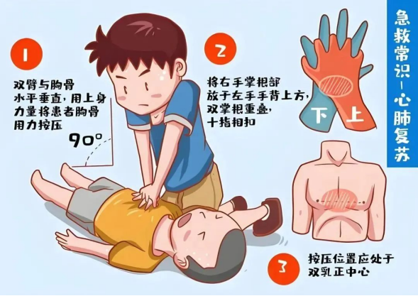 4.人工呼吸:捏鼻、对口吹气2次(每次1秒,见胸廓起伏),重复“30按压+2呼吸”循环。 关键提示:非专业人员可只做胸外按压,等待专业救援。