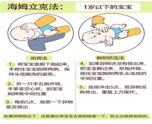 面部朝下,头低脚高,在背部肩胛骨间拍打5次。 翻转成面朝上,两指在乳头连线下方按压5次,重复直至异物排出。