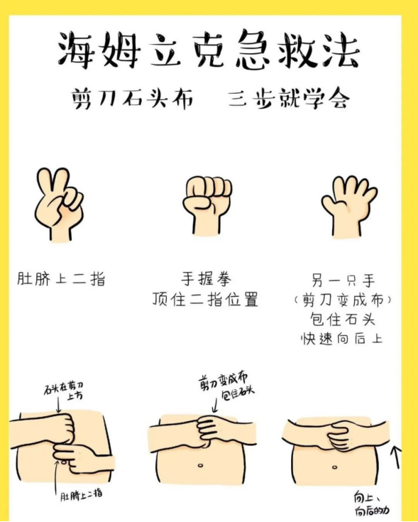 海姆立克急救法的七字口诀是“剪刀、石头、布”。具体操作步骤如下:施救者站在患者身后,患者上身稍前倾,剪刀定位放在肚脐上两横指处,石头即空心拳放在剪刀的上面,布即包裹住拳头,然后用力的向内、向上冲击腹部,直至异物排出。