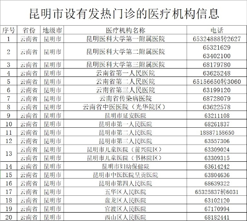 昆明市30家设置有发热门诊的公立医疗机构名单及联系方式: