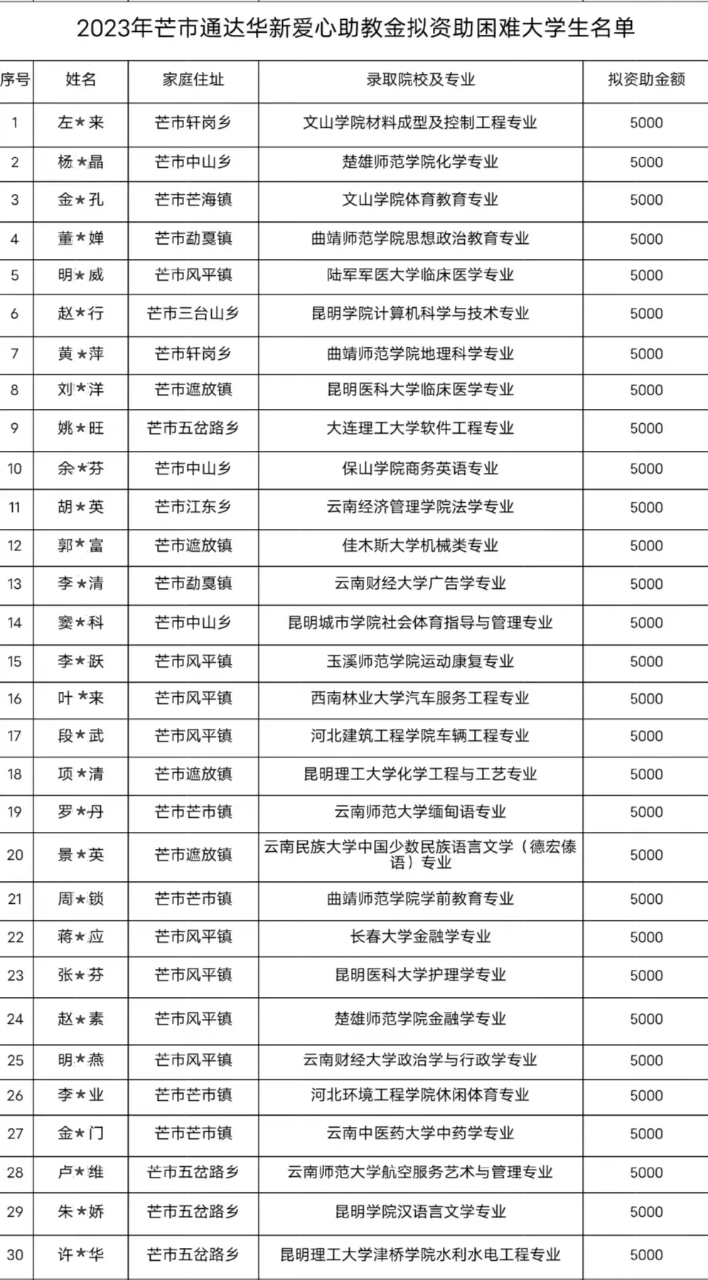 芒市通达华新爱心助教金2023年度拟资助困难大学生名单公示