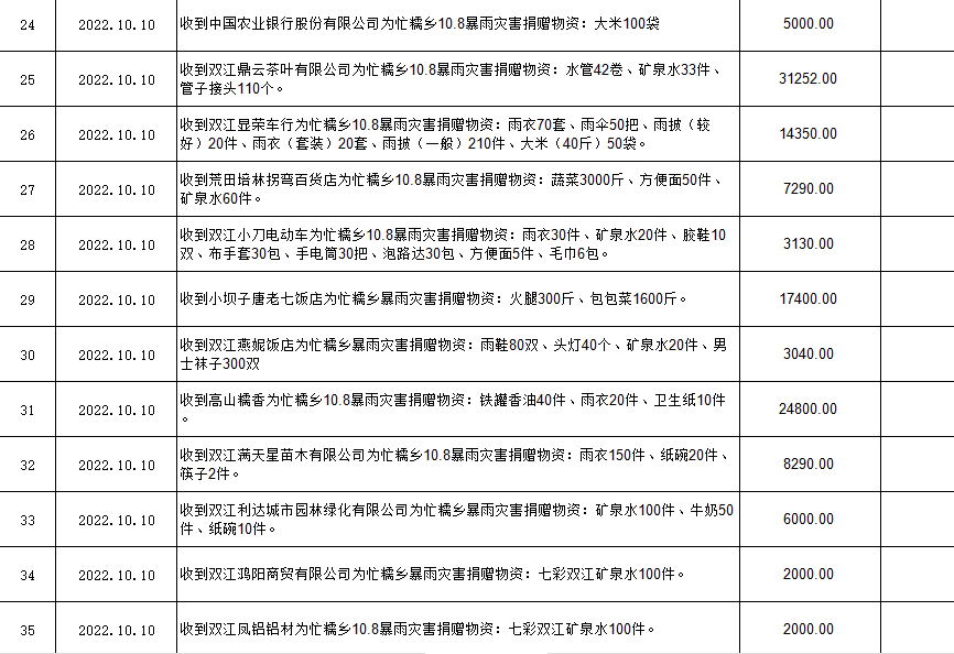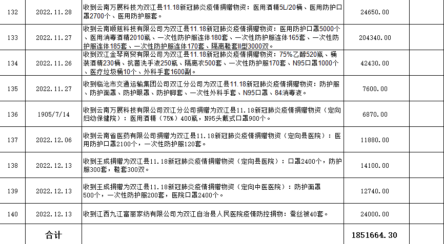(三)捐赠物资接收及拨付情况。接口罩、面条、雨衣等物资,折合人民币1851664.30元(壹佰捌拾伍万壹仟陆佰陆拾肆元叁角)。(具体明细见下表)