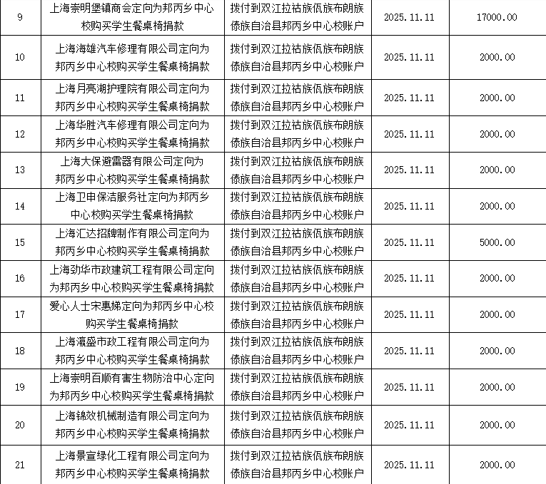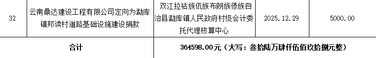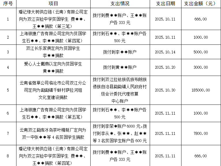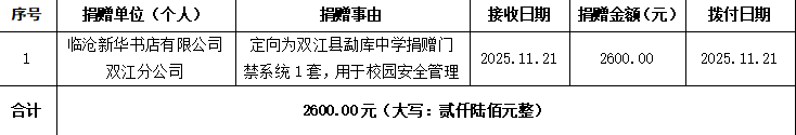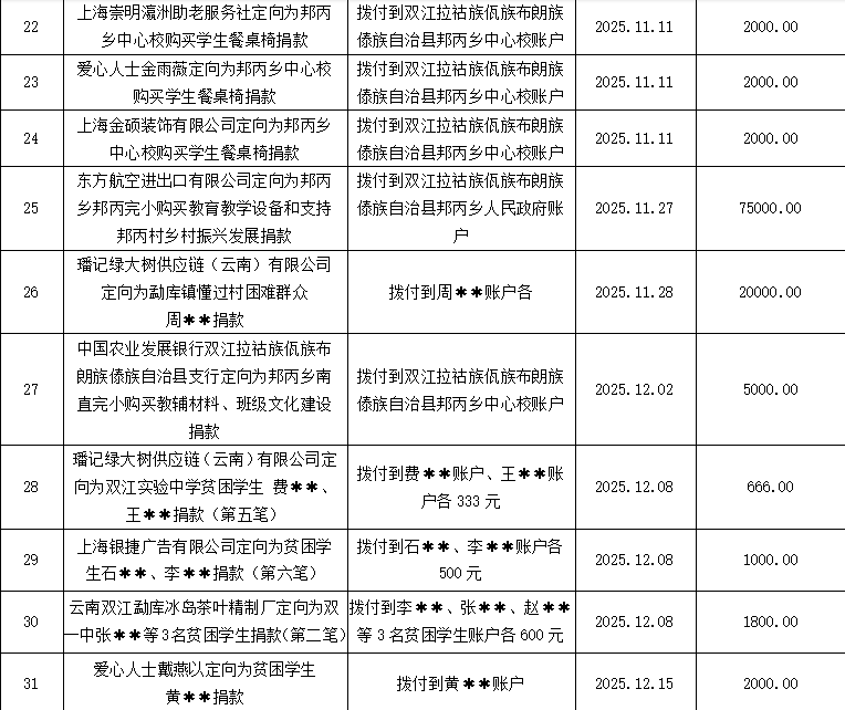 双江自治县红十字会是党领导下的群团组织,是从事人道主义工作的社会救助团体,是党和政府在人道领域的助手和联系群众的桥梁纽带,开展社会募捐和救助是《中华人民共和国红十字会法》赋予的法定职责。现将双江自治县红十字会2025年10-12月社会捐赠资金、物资接收和使用情况公示如下: