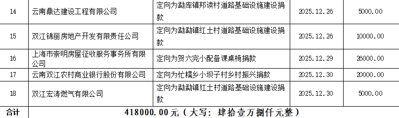 (一)捐赠资金收入情况:通过双江自治县红十字会银行专用账户接收捐款418000.00元。(具体明细见下表)