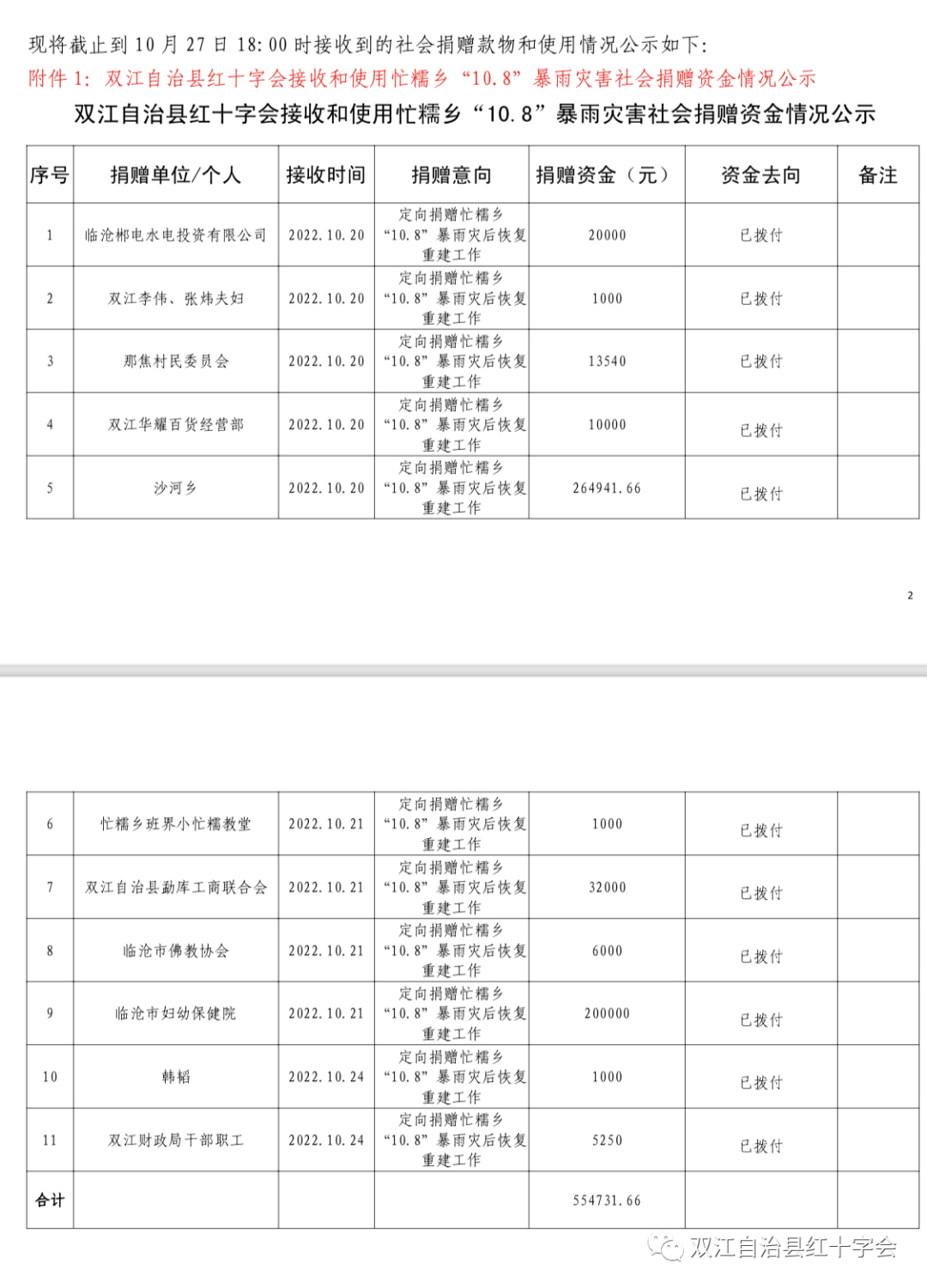 双江自治县红十字会2022年10月19日18:00时—27日18:00时共接收社会各界爱心捐赠款物合计554731.66元,(其中捐赠资金554731.66元,捐赠物资折价0元)。所有接收到的捐赠资金及物资均按照捐赠者意愿管理和使用。特此公告并接收社会各界的监督。