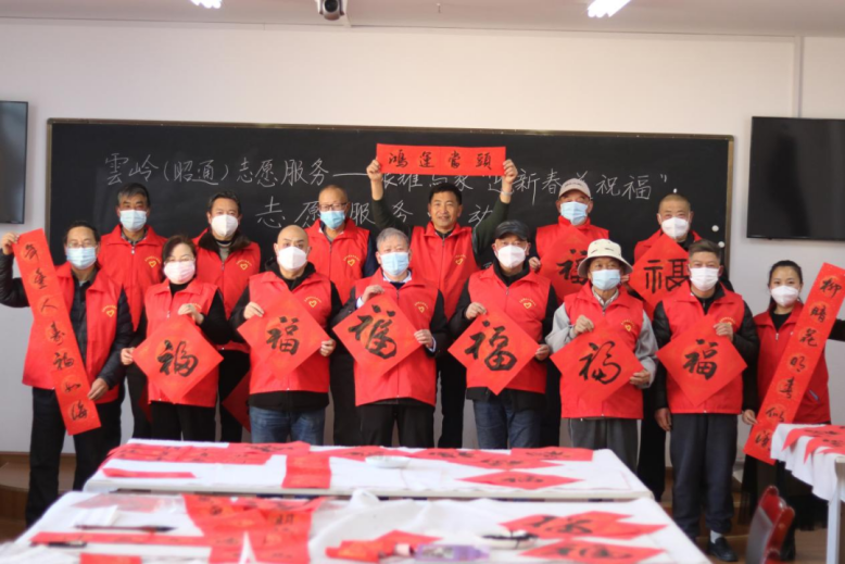 来自昭通市银耀乌蒙志愿服务协会的老年志愿者们也不甘示弱,积极参与“迎新春 送祝福”志愿服务活动,一展老年志愿者风采, 在昭通市老年大学的书法教室里聚集了十几位银发老人,他们拿着手中的毛笔正凝神静气地书写着一幅幅春联,这些春联也将在年前送给昭阳区大村村和北正街社区、彝良县漆树村的群众,为他们送去新春的祝福。