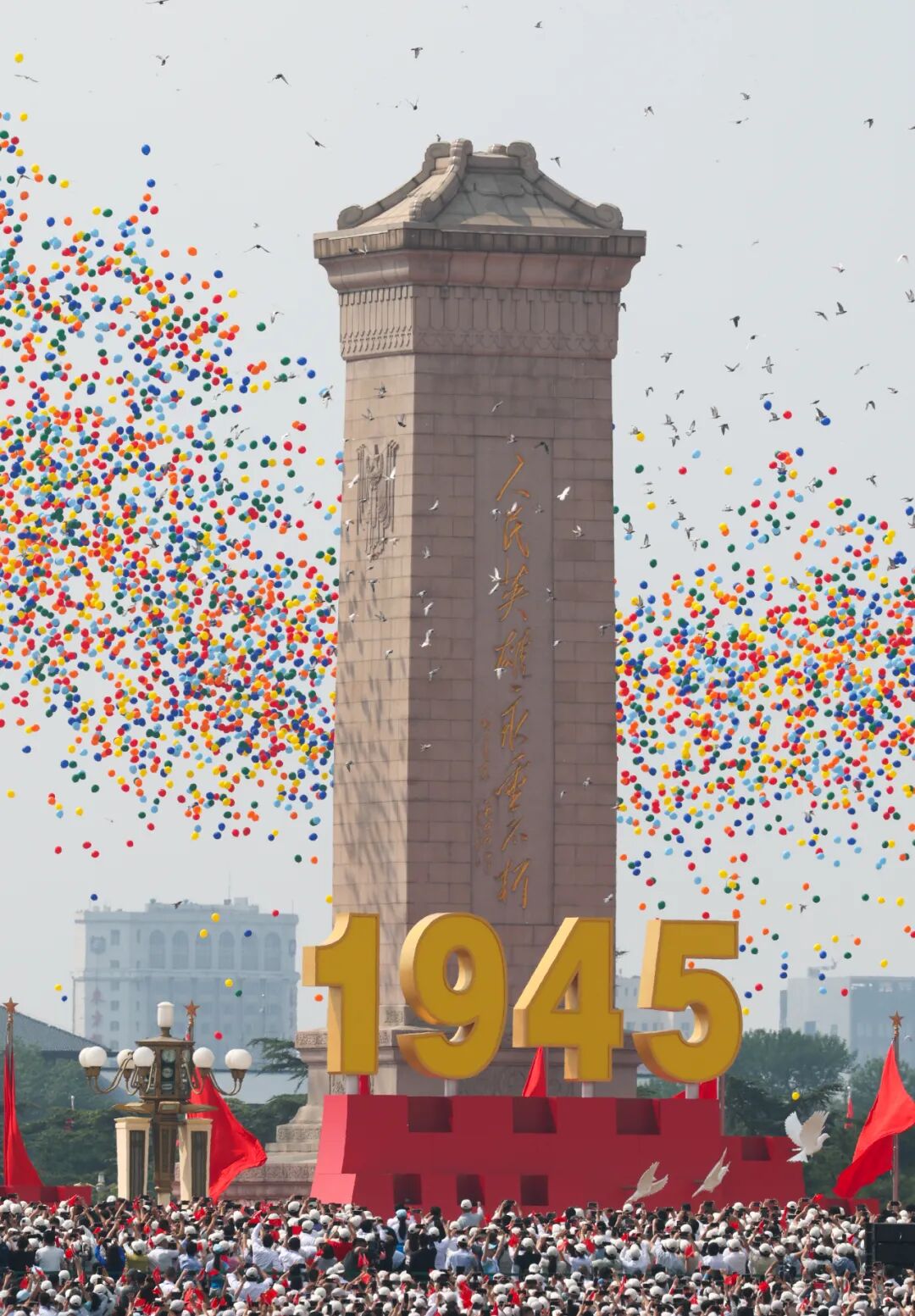 这是纪念大会现场放飞和平鸽和气球。新华社记者 殷刚 摄