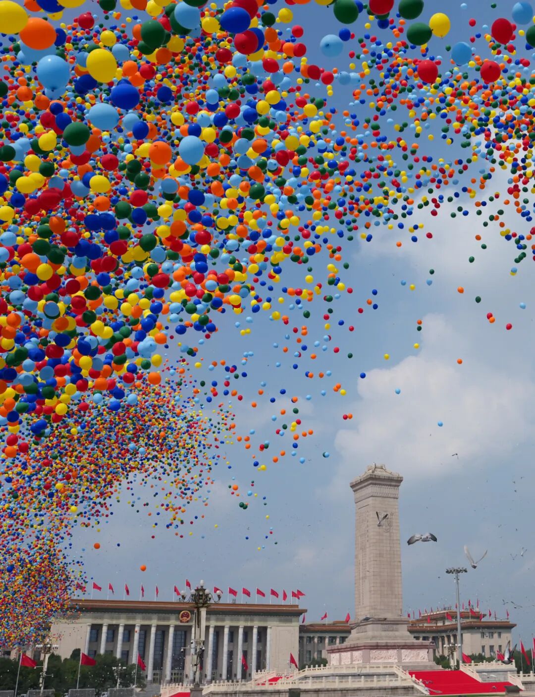 这是纪念大会现场放飞气球和鸽子。新华社记者 牟宇 摄