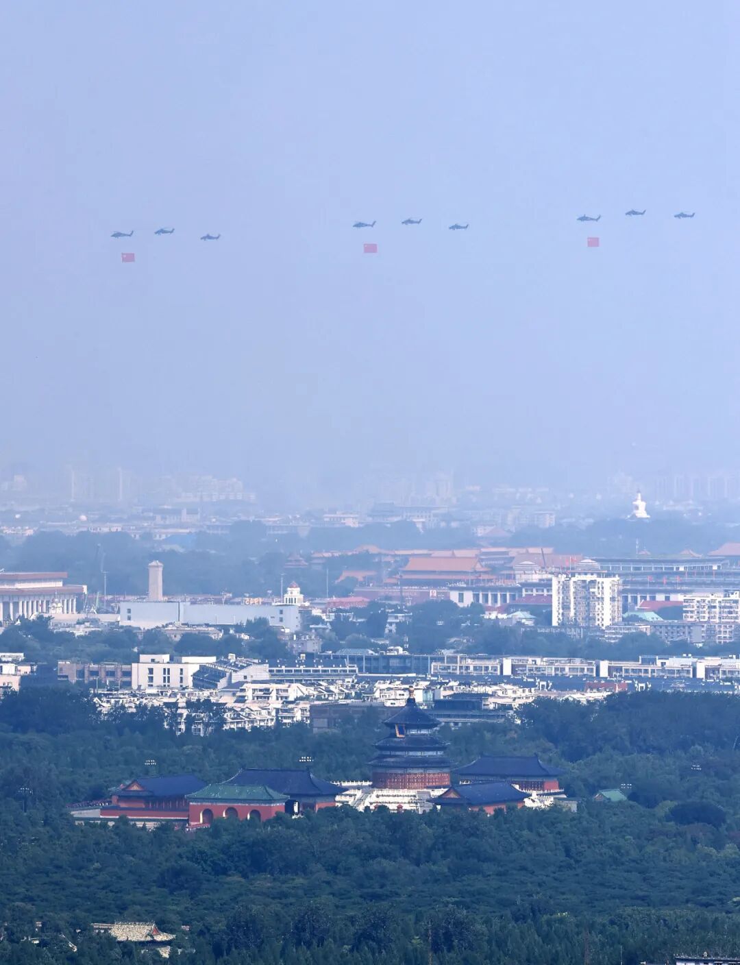 这是空中护旗梯队通过天安门广场,3架直-8L运输直升机分别悬挂“正义必胜”“和平必胜”“人民必胜”条幅。新华社记者 李钢 摄
