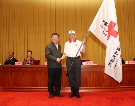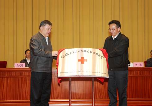 陈竺向依托云南省第二人民医院建设的中国红十字(云南)医疗救援队,以及中国红十字(吉林)医疗救援队、中国红十字(新疆)医疗救援队授旗。 陈竺、高峰为中国红十字云南阜外心血管病医院揭牌,该医院成为继中国红十字华山医院后,由中国红十字会冠名的第二家医疗机构。