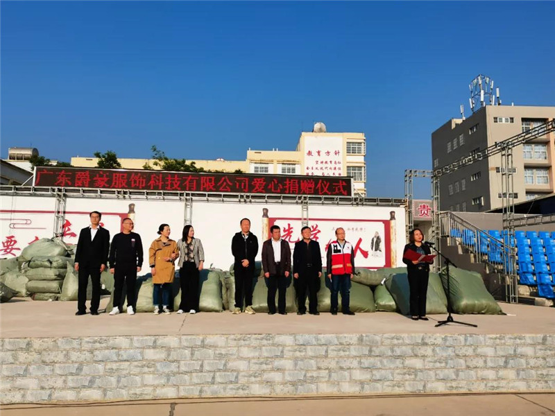 捐赠仪式上,广东爵豪服饰科技有限公司共向县人民政府捐赠学生校服(夏服、冬服)、成人外衣、外裤及工作服1批,价值约309万元,所捐赠衣物将惠及禄丰县职业高级中学、特殊教育学校及各乡镇28所小学5000余人。