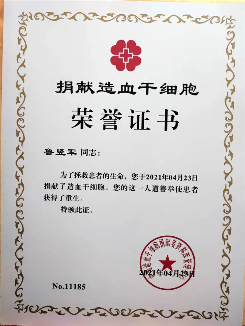 “我每年都参加献血活动,自己身体素质也比较好,在得知我的造血干细胞能够挽救别人的生命时,我没有考虑其他更多的事情,立刻就决定捐献了”。在问及鲁竖军捐献初衷时,他感慨的说道 “当时加入骨髓库对捐献造血干细胞就有所了解,在得知配型成功后,我很激动,因为救人是我加入中华骨髓库的初心,而健康是人生最大的资本,我的血样能够与一个孩子配型成功,能够挽救他的生命,我感到很高兴,我也有孩子,作为一名父亲,我也希望那位接受捐献的孩子能够因为我的捐献而获得健康,重获新生” 。