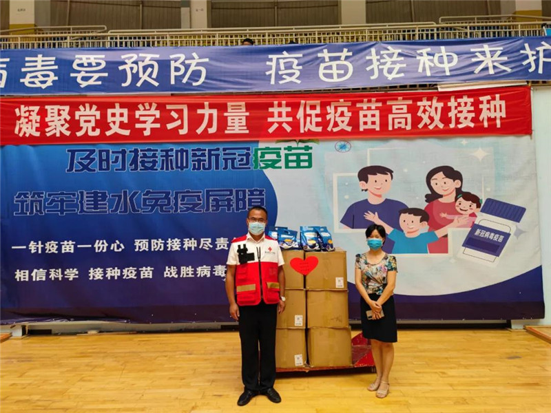 2021年7月12日,建水县红十字会在建水县奥城体育运动中心疫苗接种点,开展“爱心咖啡捐赠仪式”,将爱心人士捐赠给疫苗接种点的“爱心咖啡”送到工作人员手中。县卫健局副局长杨洋代表工作人员接受了捐赠,并对爱心人士对疫情防控工作的支持表示衷心感谢,因为大家“守望相助,众志成城”,对疫情防控的胜利更有信心了。