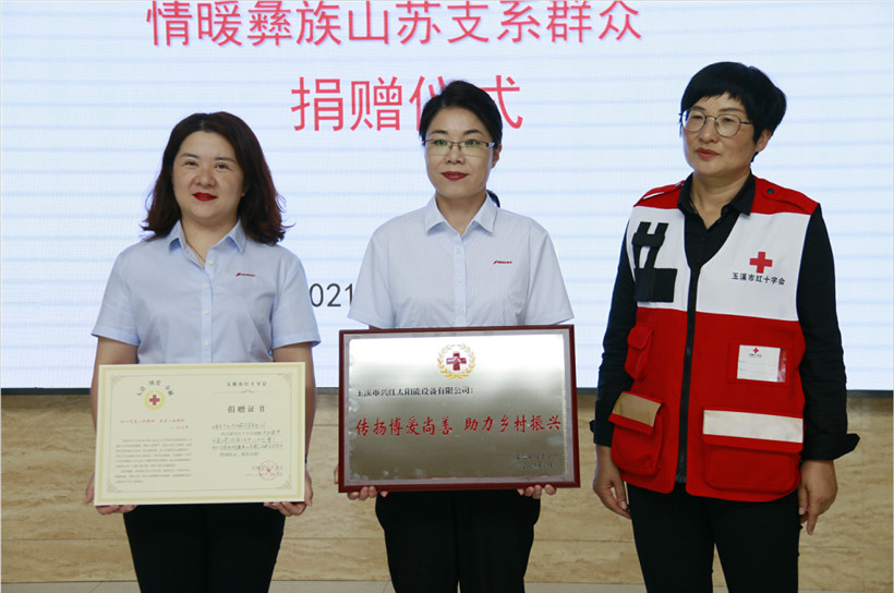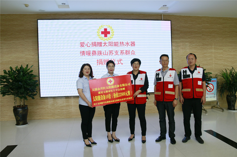 在党史学习教育中,玉溪市红十字会聚焦山区特少数民族生产生活,广泛动员社会力量帮助彝族山苏支系群众改善生产生活条件,助力乡村振兴。7月20日下午,玉溪市兴红太阳能设备有限公司通过市红十字会向新平县彝族山苏支系群众捐赠了价值人民币22800元的太阳能热水器10套,旨在改善彝族山苏支系群众的生活质量。