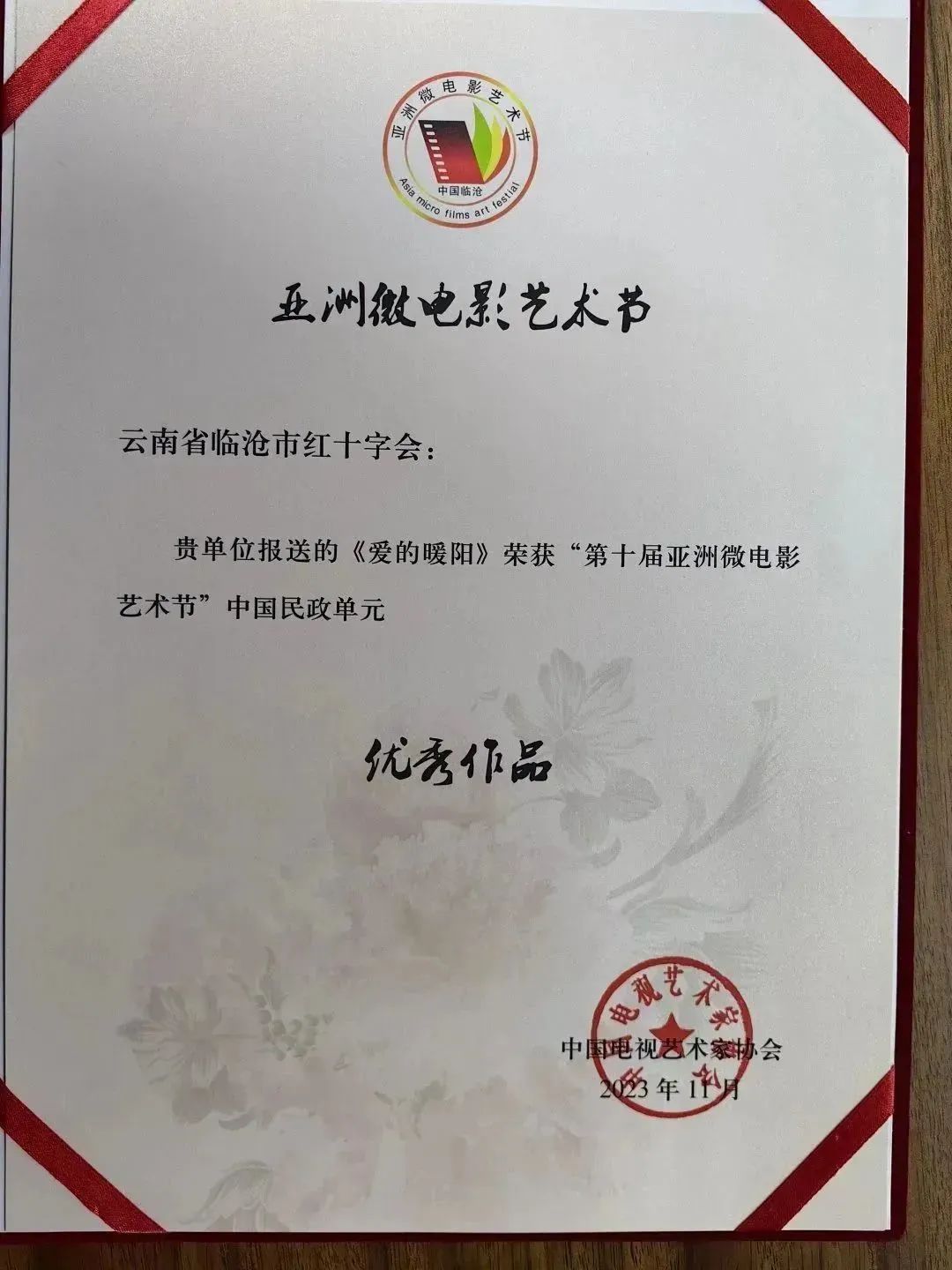 海棠绽放,满城阳光!11月24日至26日,第十届亚洲微电影艺术节在临翔隆重举行。临沧市红十字会组织拍摄的《爱的暖阳》微电影荣获第十届亚洲微电影艺术节中国民政单元优秀作品奖。
