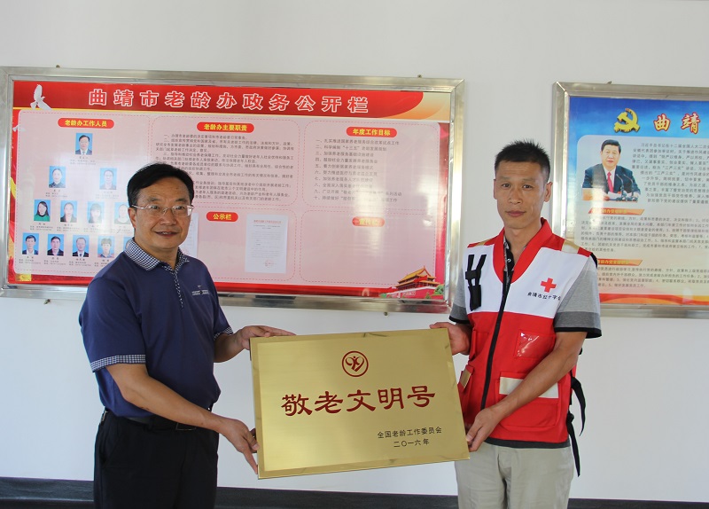 原曲靖市老龄办党组书记、主任翟应江为市红十字会颁发“全国敬老文明号”牌匾