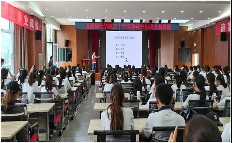 根据军训任务安排,部分同学在大学生活动中心学生会堂观看了由玉溪市人民医院陈斌医生带来的红十字应急救护知识公益讲座,大部分同学则以班级为单位在受训场地集中观看应急救护知识培训网络直播。