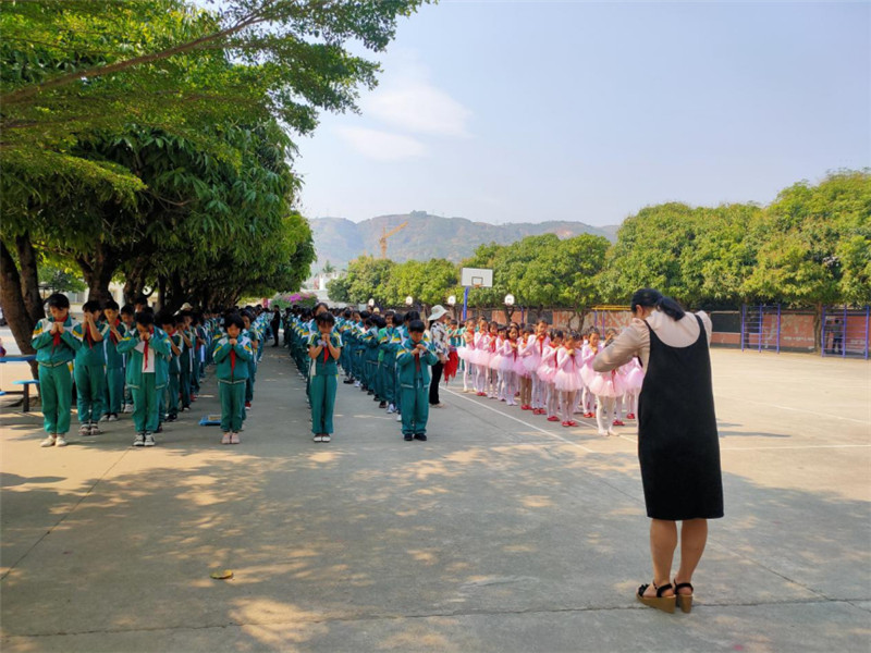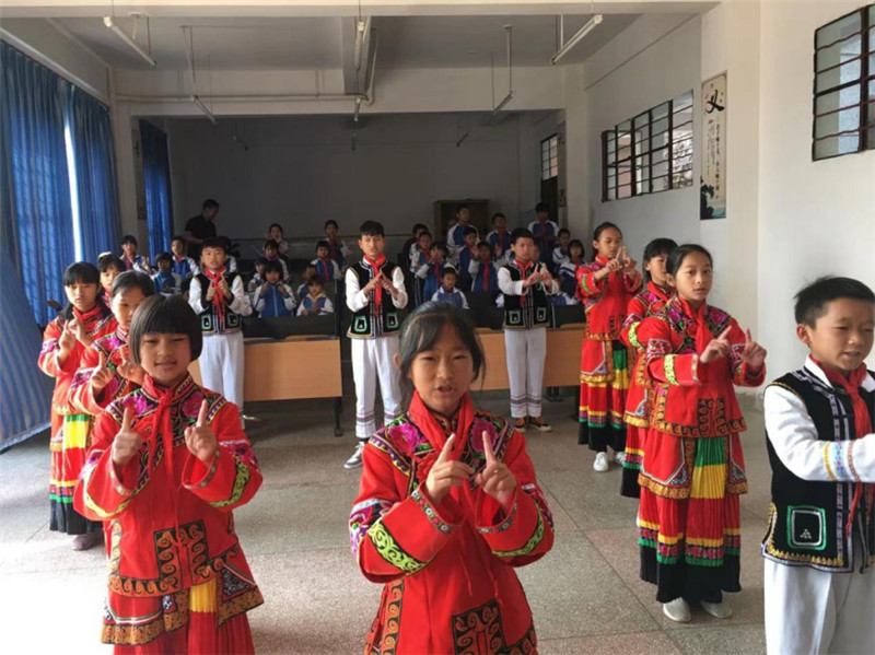 受到资助的孩子们表演《听我说谢谢你》手势舞