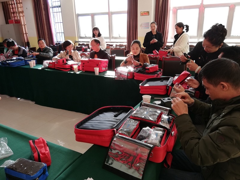 云南省红十字会筹资财务部调研员曹铠、云南轩勋商贸有限公司总经理王红、上海跃进医用光学器械厂驻云南经理杜文智、云南轩勋商贸有限公司销售经理刘树美出席捐赠仪式。捐赠仪式由昭通市红十字会副会长郑其晖主持,市红十字会赈济救护部全体干部职工及受捐赠村卫生室负责人参加捐赠仪式。上海跃进医用光学器械厂驻云南经理杜文智向对巡诊包内的所有设备操作使用向医生们培训。