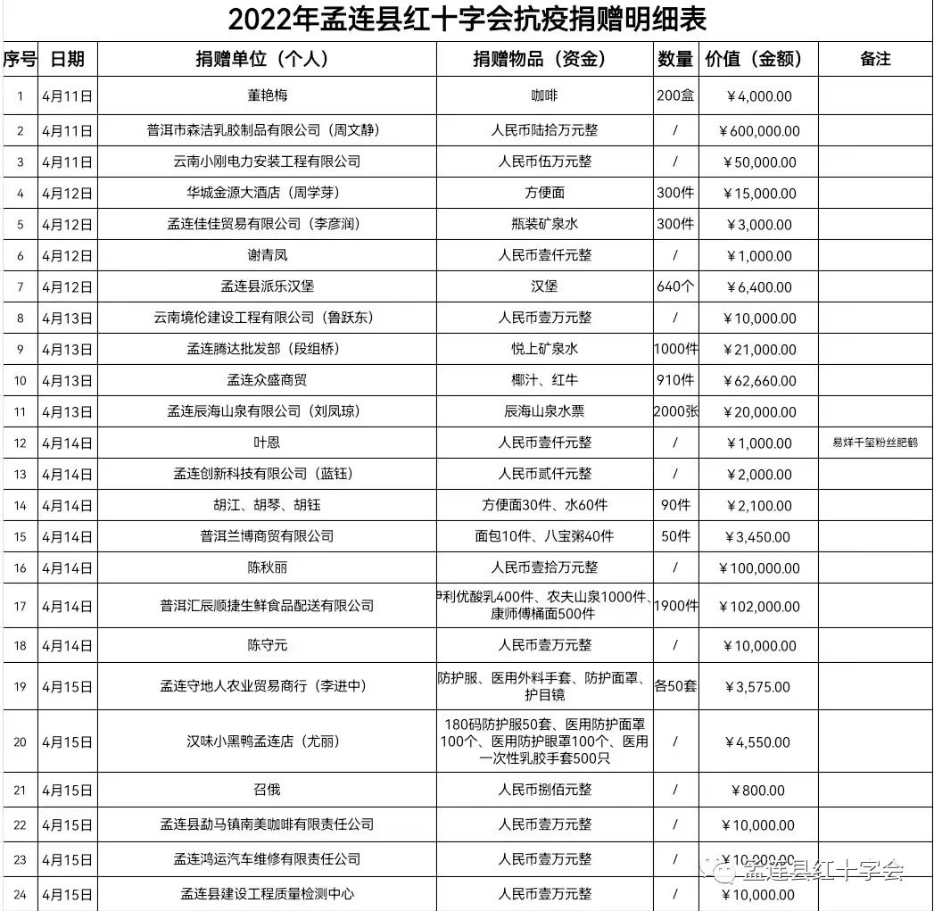 新冠无情,人间有爱,值此孟连县全民防控疫情的关键时期。孟连县爱心企业和爱心人士积极捐赠资金和各类物资支援孟连县疫情防控。截至4月15日,孟连县红十字会共接收到抗疫资金80.48万元,生活物资和抗疫物资等价值24.7735万元。