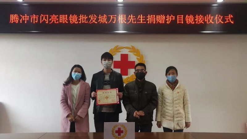 2月1日,腾冲闪亮眼镜批发城万根先生向腾冲市红十字会爱心捐赠648副护目镜,为腾冲市一线医护人员送来爱心防护,助力腾冲市新型冠状病毒感染的肺炎疫情的防控。腾冲市红十字会第一时间把物资送往指挥部,分配到疫情防疫一线。