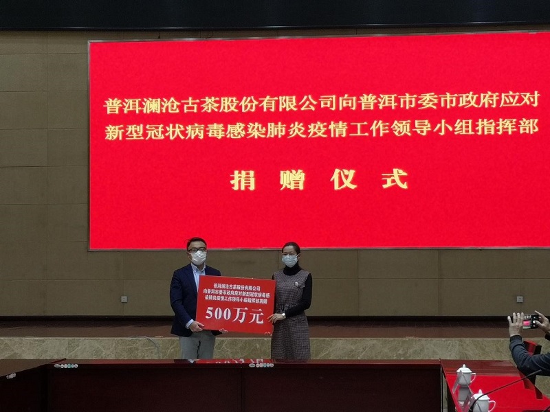 在全国上下共同抗击新型冠状病毒感染肺炎疫情的关键时刻,普洱澜沧古茶股份有限公司积极响应普洱市委、市政府的号召,2月2日向普洱市委市政府应对新型冠状病毒感染肺炎疫情工作领导小组指挥部捐赠爱心善款500万元,捐赠仪式在普洱市行政中心举行,应对新型冠状病毒感染肺炎疫情工作领导小组指挥部指挥长、市政府副市长、市红十字会会长胡剑荣,副指挥长、市政府副市长李荣出席捐赠仪式。