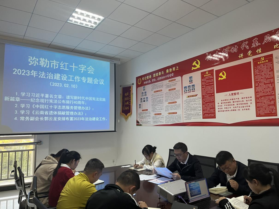 2月13日上午,弥勒市红十字会召开市红十字会2023年法治建设工作专题会议,传达学习习近平署名文章《谱写新时代中国宪法实践新篇章——纪念现行宪法公布施行40周年》和《中国红十字志愿服务管理办法》《云南省遗体捐献管理办法》,对2022年法治建设工作进行总结并就扎实做好红十字会2023年法治建设工作作安排部署。