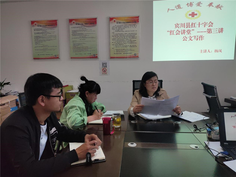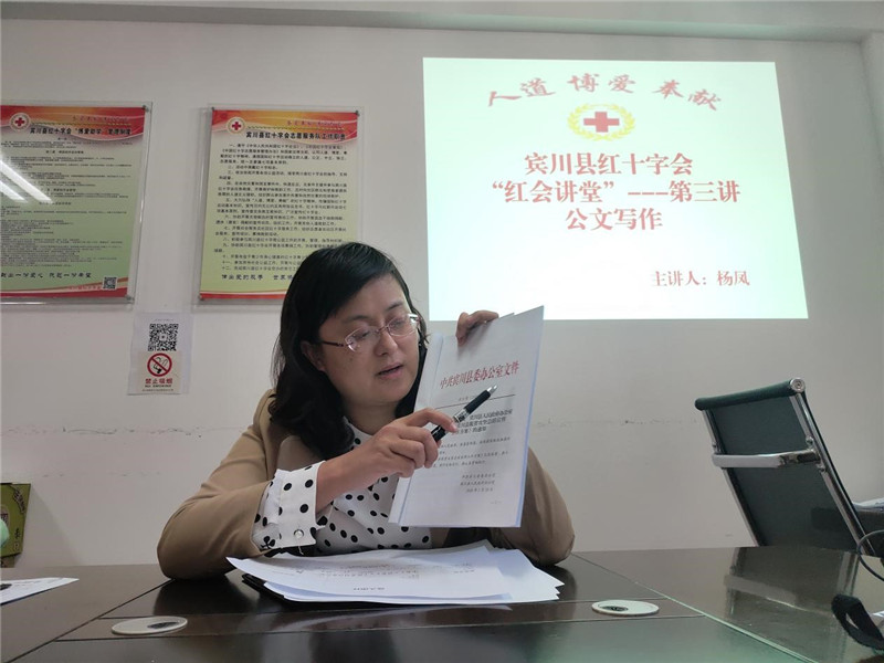3月30日,宾川县红十字会2020年红会讲堂第三讲开讲,办公室主任杨凤以“党政机关公文写作”为主题与全体干部职工一起交流学习,加强大家对党政机关公文的写作能力。