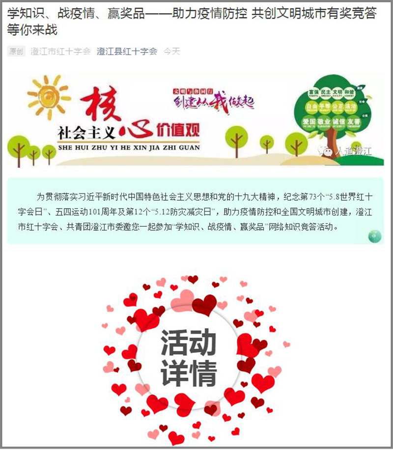 一是联合共青团澄江市委,在云南德春绿色食品有限公司和云南澄江印象抚仙湖旅游产品开发有限公司的支持下,于5月8日至5月14日通过“澄江县红十字会”“人道澄江”“青春澄江”微信公众号开展“助力疫情防控 共创文明城市”有奖竞答活动,利用寓教于乐的方式让社区群众主动了解红十字会、共青团、疫情防控和文明城市创建等相关知识。