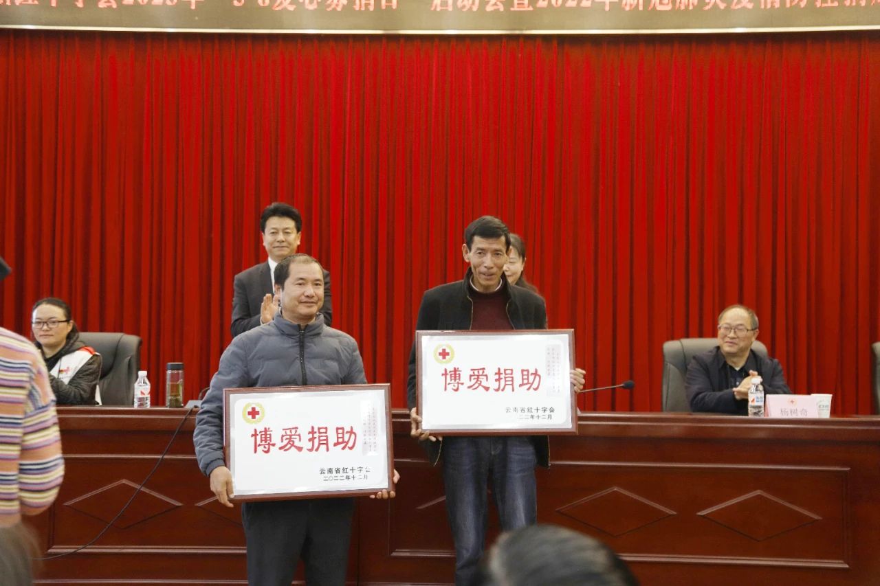 会议通报了2022年度“5·8爱心募捐日”资金募捐、结余和开展人道救助工作情况以及2022年以来新冠肺炎疫情防控社会捐赠款物收支情况,通报表扬了红十字工作先进集体和先进个人,并向受到云南省红十字会表彰的2022年度优秀捐赠单位颁发“博爱捐助”荣誉匾牌。与会领导为参与2022年度“5·8爱心募捐日”活动的募捐单位和企业代表颁发捐赠证书。