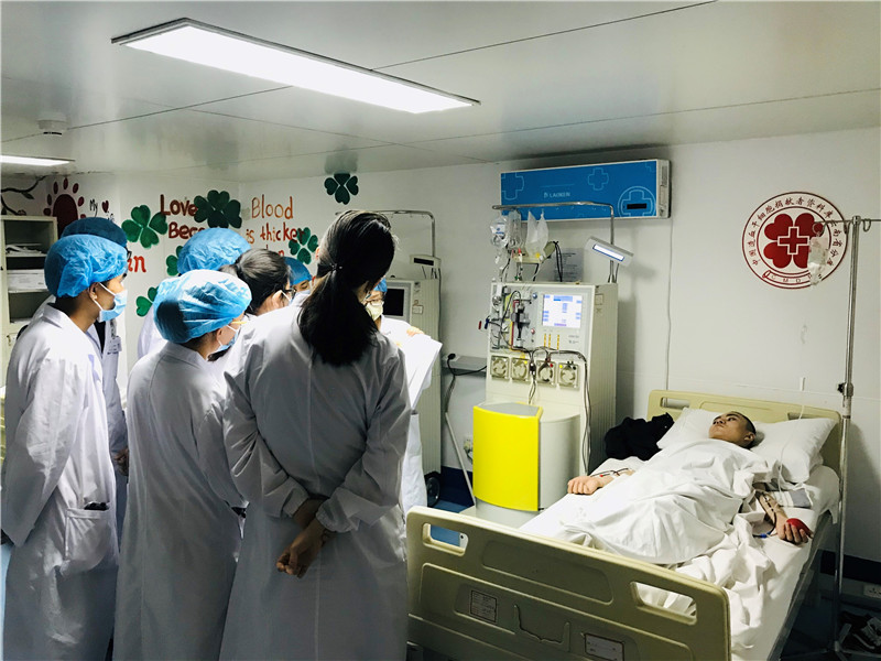 杨文润接受造血干细胞采集,医护人员陪同并观察。