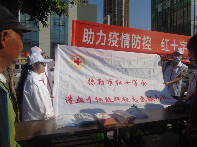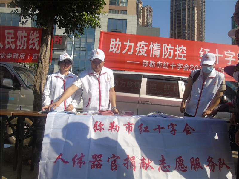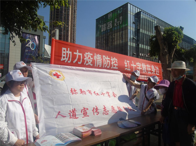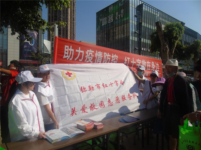 为弘扬“人道、博爱、奉献”的红十字精神,在第73个“世界红十字日”和“5•12”防灾减灾日来临之际,我会向志愿者们发出倡议,邀请他们参与红十字博爱周系列活动。5月11日上午,弥勒市红十字会认真组织4支红十字志愿服务队到弥阳镇仁和商贸城门口开展“助力疫情防控,红十字救在身边”主题宣传志愿服务活动。