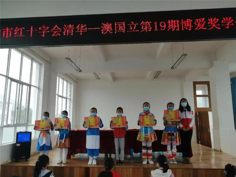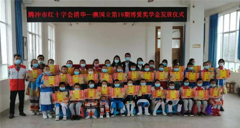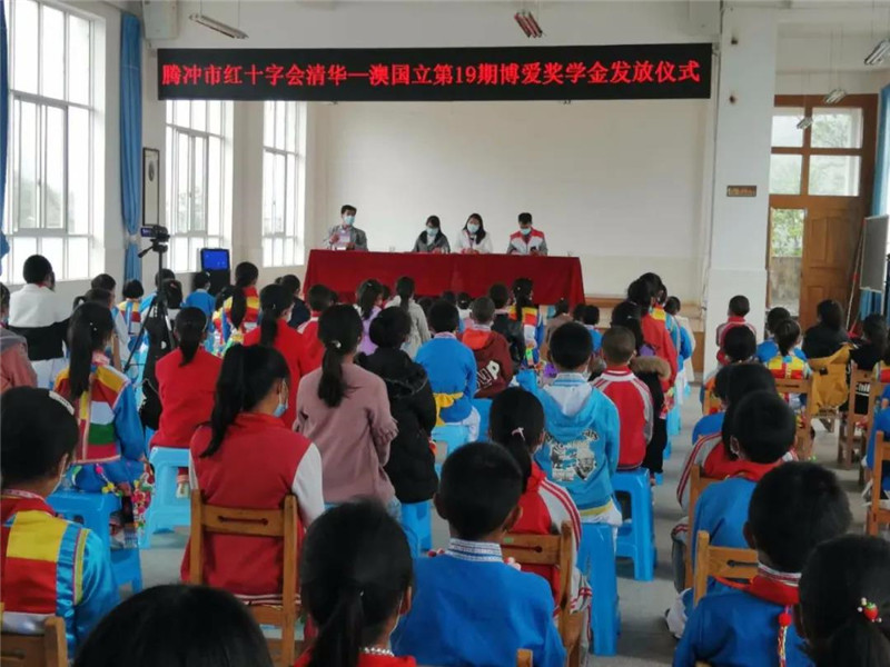 据悉,“清华—澳国立第19期博爱奖学金”共6万元,分三期发放,根据捐赠人的意向,腾冲市红十字会对上报学生情况进行了审核把关,并在捐赠方同意后组织此次发放,本次活动意在学生中培养比学赶超的进取精神和感恩意识,也把党和政府,社会各届爱心人士的关怀传递到边疆和少数民族同胞的心中。