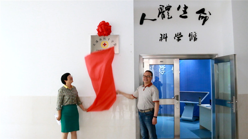 省红十字会秘书长杨家俊(右),市红十字会党组书记、常务副会长欧光荣(左)共同为玉溪市红十字会生命科学教育培训基地揭牌