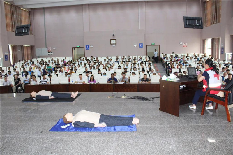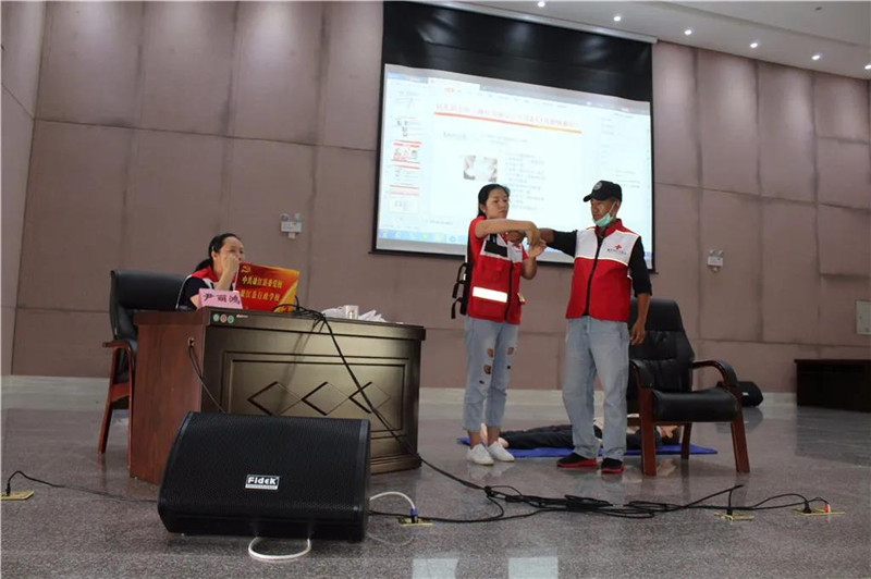 培训上,盈江县红十字会常务副会长尹丽鸿同志结合生活中常见的突发状况,以生动的语言、真实的案例,重点讲解了红十字基本知识、救护新概念、心肺复苏术、创伤救护、常见急症等五大方面的内容。并强调了心肺复苏操作步骤、自动体外除颤器(AED)使用、常用包扎及骨折固定方法等实操应注意的事项。县红十字会志愿者雷庆松老师为大家讲授生活中的一些突发急症如急性冠状动脉综合征、脑血管意外、溺水、触电、气道异物梗阻等急救知识。培训现场老师学员互动频繁,尤其在实操环节中,大家积极主动在模拟人身上反复练习心肺复苏、积极为身边“伤员”包扎伤口。