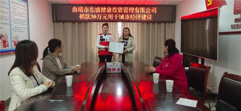 10月30日,曲靖市东盛健康投资有限公司捐赠20万元、曲靖市东盛物业服务有限公司分别捐赠10万元用于麒麟区白石江街道官坡社区城市经济建设、助推全国文明城市创建。