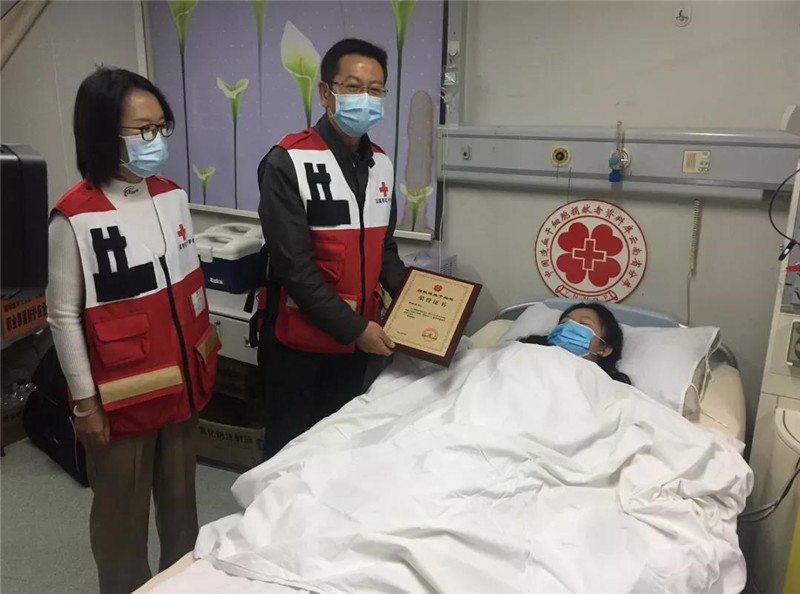 10月30日上午,玉溪市红十字会党组成员、副会长田海泉一行到医院看望慰问冯丽婷,为她颁发了《捐献造血干细胞荣誉证书》,赞扬小冯的捐献行为是大爱、是奉献,为社会树立了一个无私奉献的好榜样。