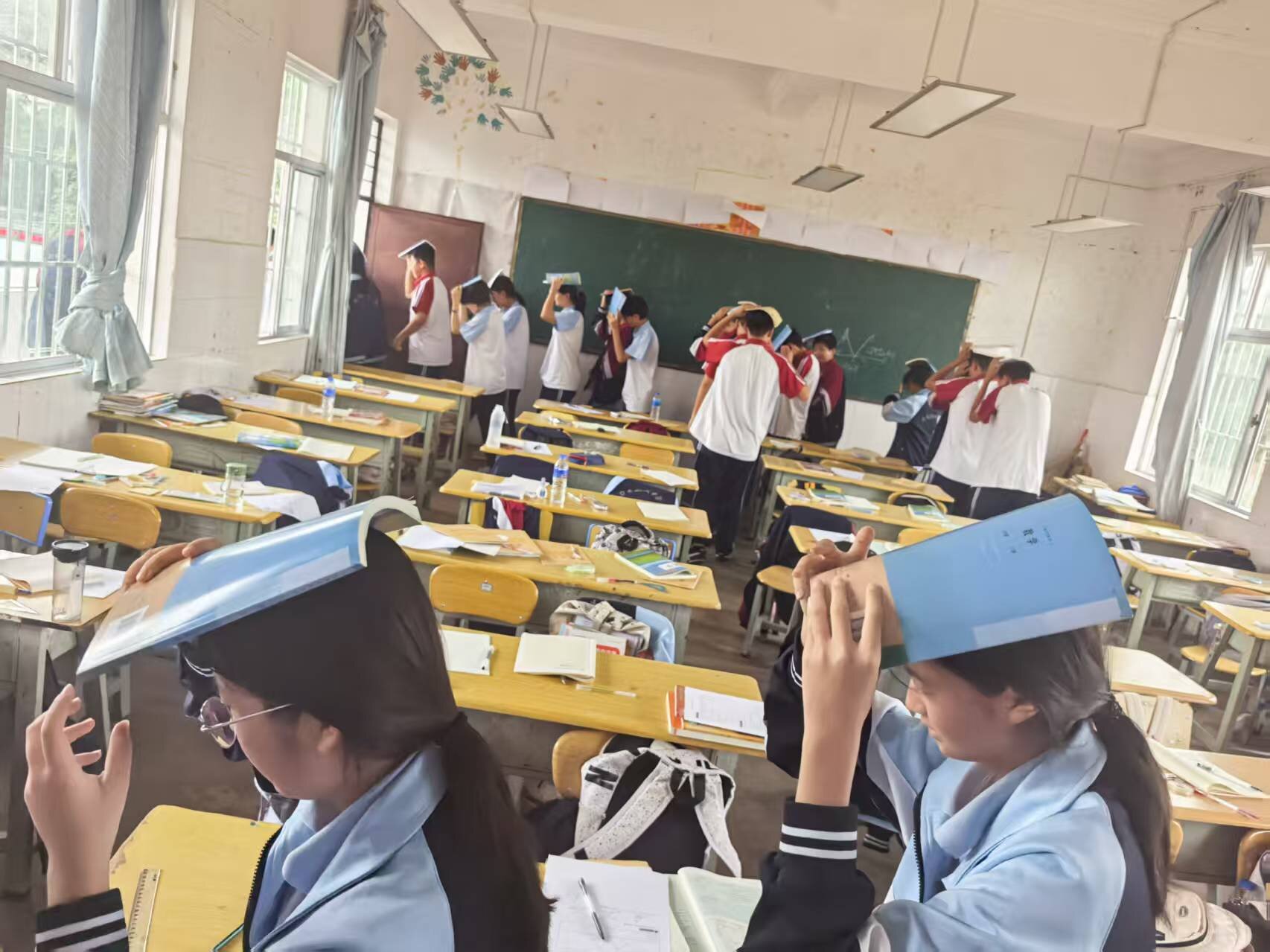 上午9时40分,随着一阵急促的地震预警声响彻校园,防震减灾演练正式拉开帷幕。教室内各班教师迅速指导学生双手抱头、蜷缩身体,躲避在坚固的课桌下。警报声切换为疏散信号后,教师引导学生们按照预定疏散路线,弯腰低姿、用书本护住头部,快速而有序地撤离教学楼,汇集至指定地点。各班班长迅速清点人数并向演练总指挥上报,确保“不落一人”……整个疏散过程用时极短,体现了高效的组织协调能力。