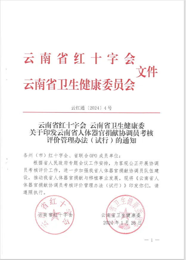 为加强我省人体器官捐献协调员队伍的建设,推动人体器官捐献与移植事业健康发展,省红十字会在广泛调研基础上,牵头起草了《云南省人体器官捐献协调员考核评价管理办法(试行)》(以下简称:办法),经过多方征求意见、多次上会研究讨论后进行修改完善,于1月29日以省红十字会、省卫生健康委联合发文形式印发执行。