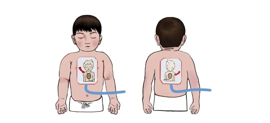 患者为婴儿或儿童:按图示将电极片贴在婴儿或儿童的胸前正中及背后左肩胛处,体格较大的儿童也可如成人的位置贴放电极片。