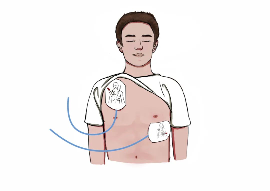 患者为成人:按图示将一片电极片贴在患者裸露胸部的右上方(胸骨右缘、锁骨之下),将另一片电极片贴在患者左乳头外侧(左腋前线之后第五肋间处)。