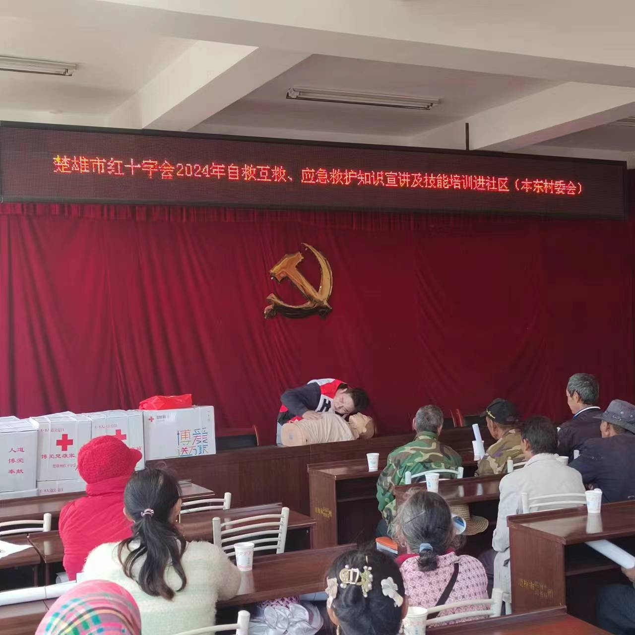 活动现场,村委会群众纷纷就坐,认真听取红十字会工作人员进行的应急救护知识及防溺水、防震减灾等知识培训。