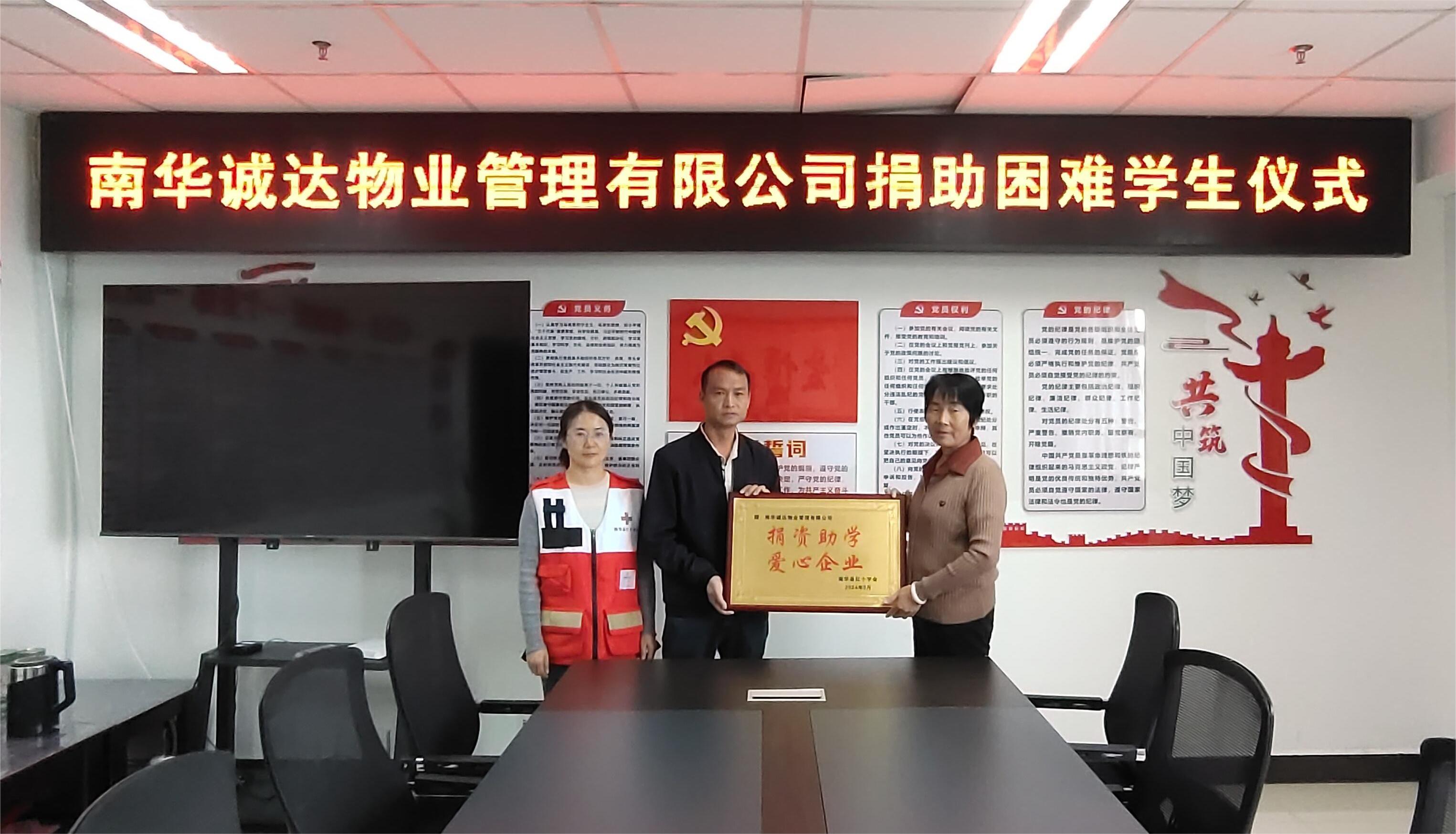9月11日,南华诚达物业管理有限公司通过南华县红十字会,向南华县一名品学兼优的困境大学生捐助20000元,帮助其解燃眉之急、顺利完成学业。
