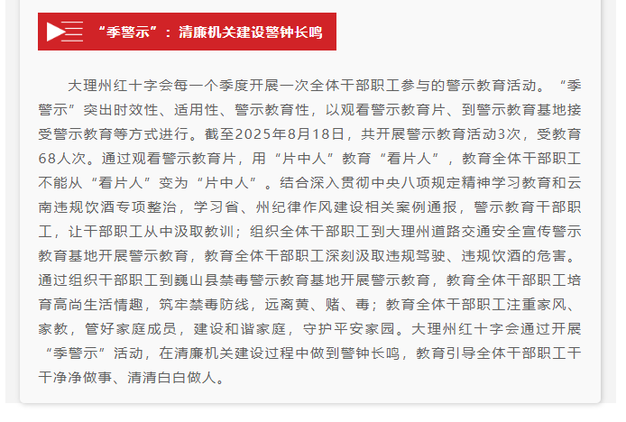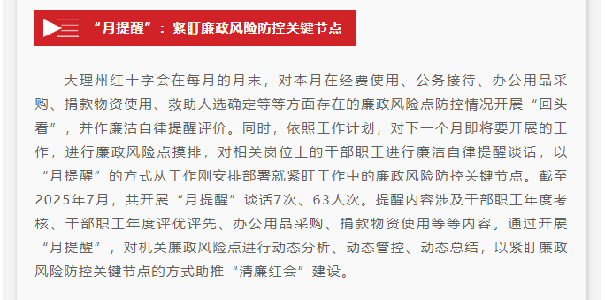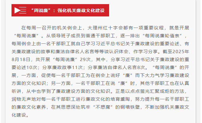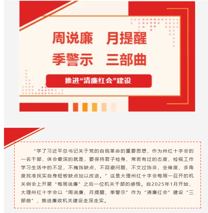 大理州红十字会以“周说廉、月提醒、季警示”“三部曲”推进“清廉红会”建设