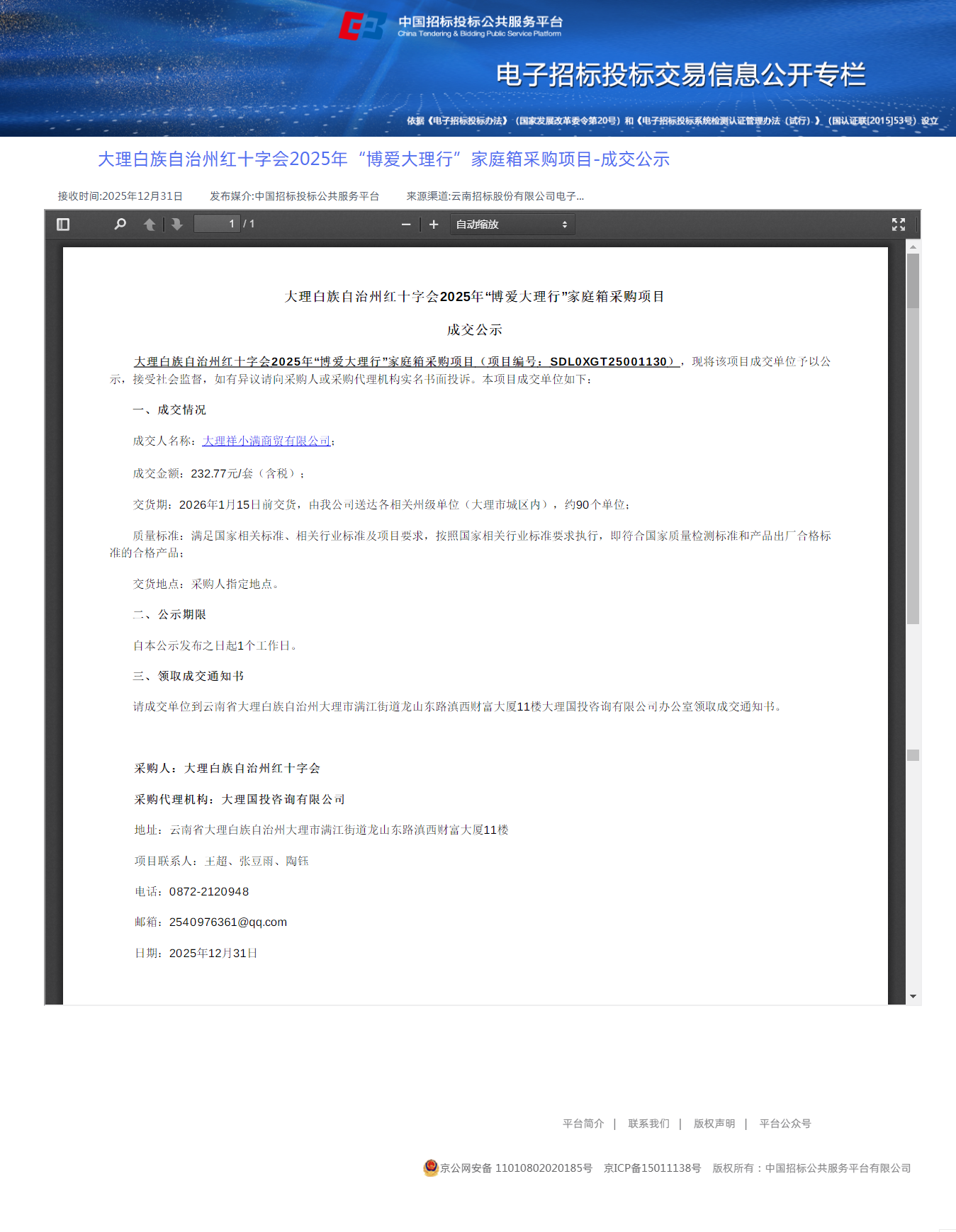 大理白族自治州红十字会2025年“博爱大理行”家庭箱采购项目成交公示