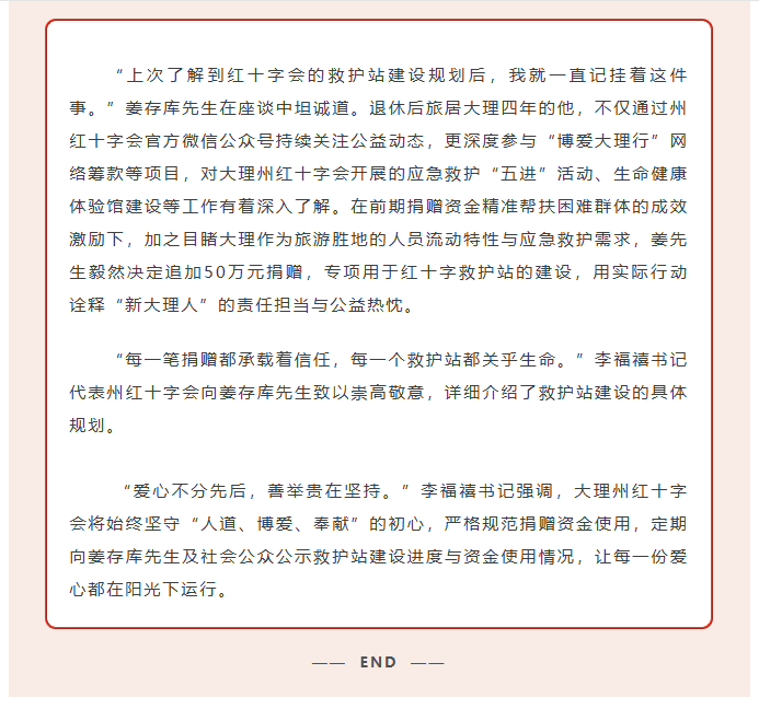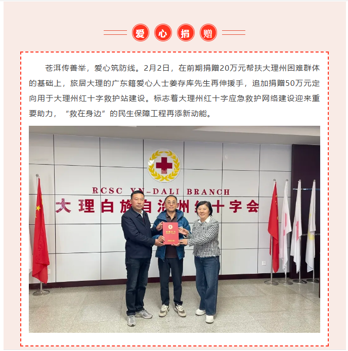 爱心再续航 生命守相望——旅居爱心人士姜存库追加50万元助力大理红十字救护站建设